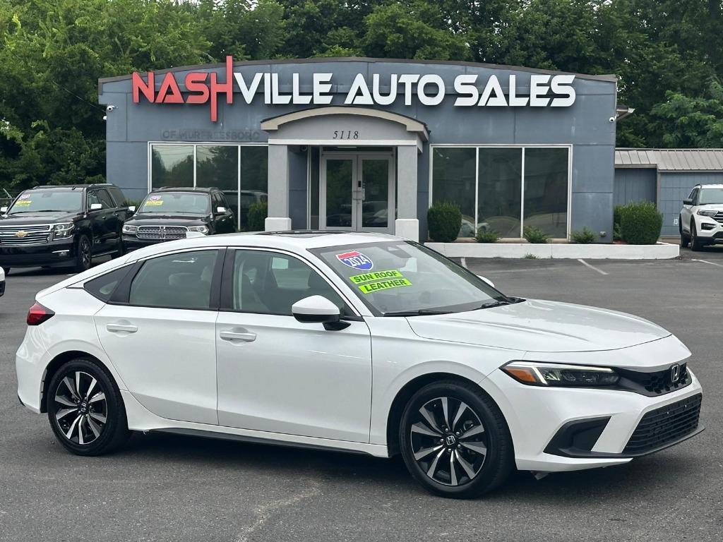 This used 2024 Honda Civic Hatchback EX-L is listed at $24,900 by nashville auto sales in Nashville, TN 37211. It has 11,640 miles on the odometer. The exterior color is White. It features a FWD drivetrain with a 1.5L I4 engine and CVT transmission.