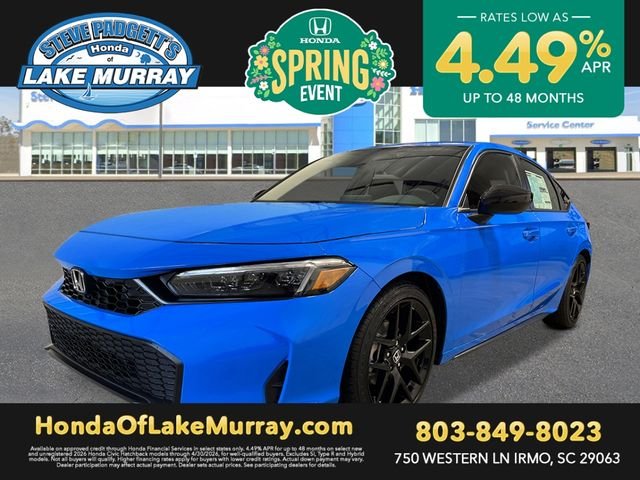 This new 2026 Honda Civic Hatchback Sport is listed at $28,838 by a franchise dealer in Irmo, SC 29063. The exterior color is Blue. It features a FWD drivetrain with a 2.0L I4 engine and CVT transmission.