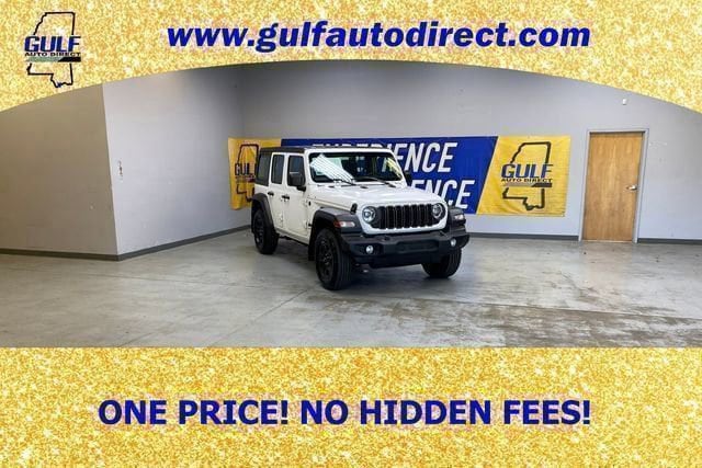 This used 2025 Jeep Wrangler 4-Door Sport is listed at $32,250 by gulf auto direct in Waveland, MS 39576. It has 8,434 miles on the odometer. The exterior color is White. It features a 4WD drivetrain with a 3.6L V6 engine and Manual transmission.