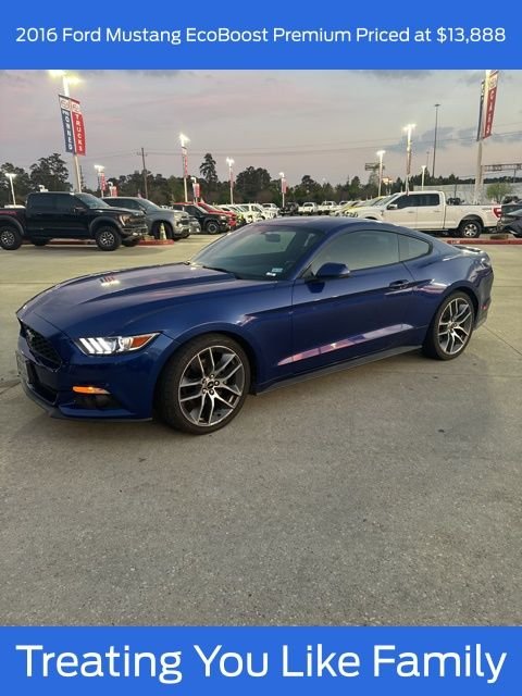 This used 2016 Ford Mustang EcoBoost Premium is listed at $13,888 by a franchise dealer in Conroe, TX 77301. It has 195,671 miles on the odometer. The exterior color is Blue. It features a RWD drivetrain with a 2.3L I4 engine and Automatic transmission.
