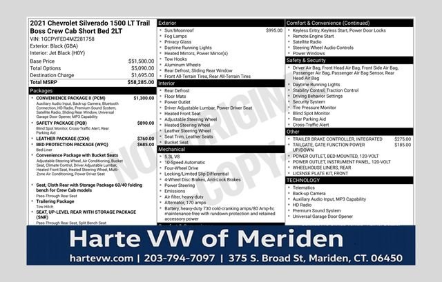 This used 2021 Chevrolet Silverado 1500 LT Trail Boss is listed at $38,500 by harte infiniti in Hartford, CT 06120. It has 89,479 miles on the odometer. The exterior color is Black. It features a 4WD drivetrain with a 5.3L V8 engine and Automatic transmission.